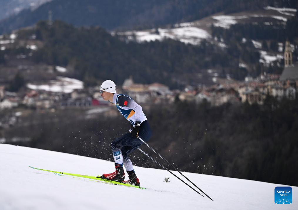 Zhao Zihe of china competes during the Cross-Country competition of Nordic Combined Individual Gundersen Normal Hill/10km at the Milan-Cortina 2026 Olympic Winter Games in Tesero, Italy, Feb. 11, 2026. (Xinhua/He Canling)