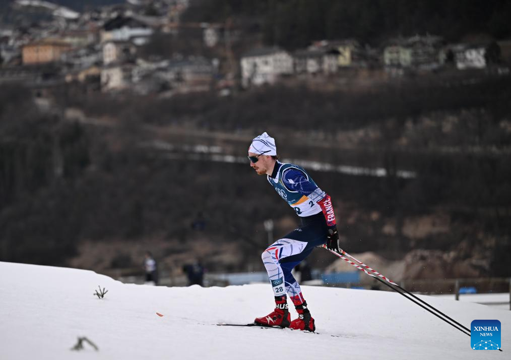 Mael Tyrode of France competes during the Cross-Country competition of Nordic Combined Individual Gundersen Normal Hill/10km at the Milan-Cortina 2026 Olympic Winter Games in Tesero, Italy, Feb. 11, 2026. (Xinhua/He Canling)