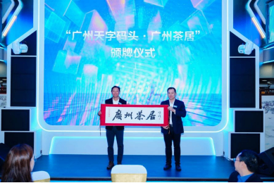 (图解:广州市侨联党组书记、主席卞勇为“广州天字码头·广州茶居”颁发题匾)