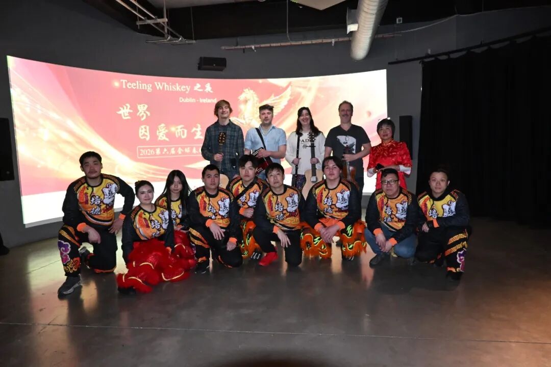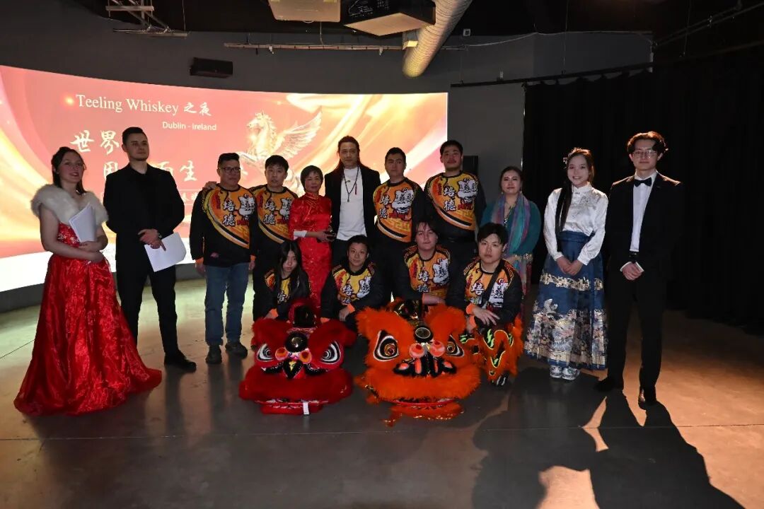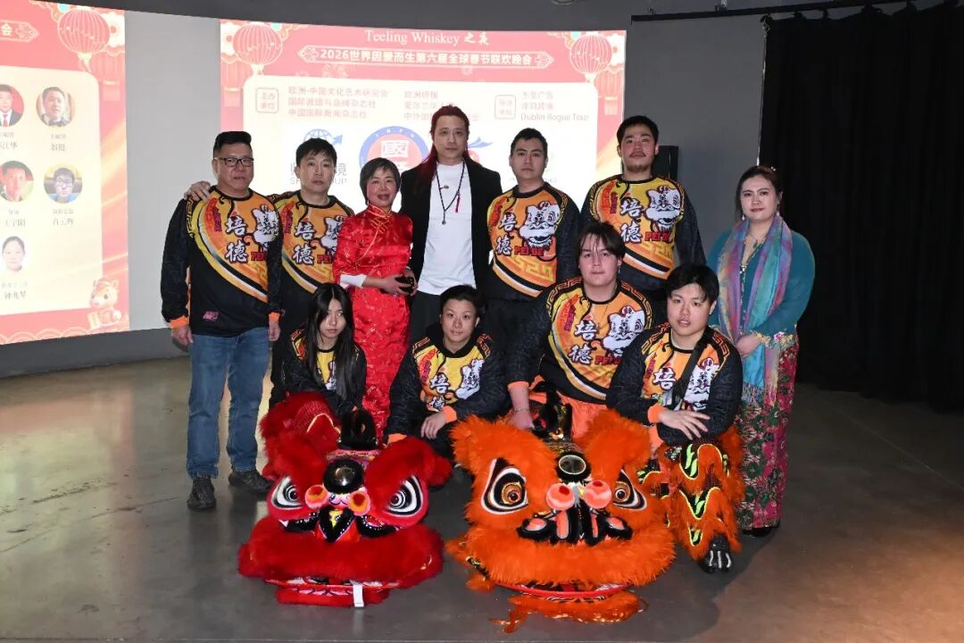 图:陈秋梅、翁挺和爱尔兰培德龙狮体育会舞狮节目组成员合影