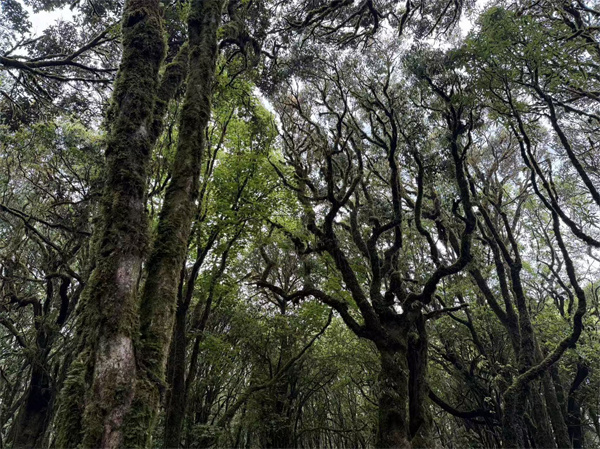 当日下午,记者团一行踏入哀牢山深处,眼前尽是“雾锁青山、云绕林海”的壮丽景象。细密的水汽从林间升腾,古树参天,藤蔓垂落,苔藓在石间悄然生长,原始森林的气息扑面而来。远处山峰若隐若现,如同浮沉在云海之上的孤岛,令人心生敬畏。风过林梢,雾气翻涌,仿佛大自然在轻声诉说千年的故事。