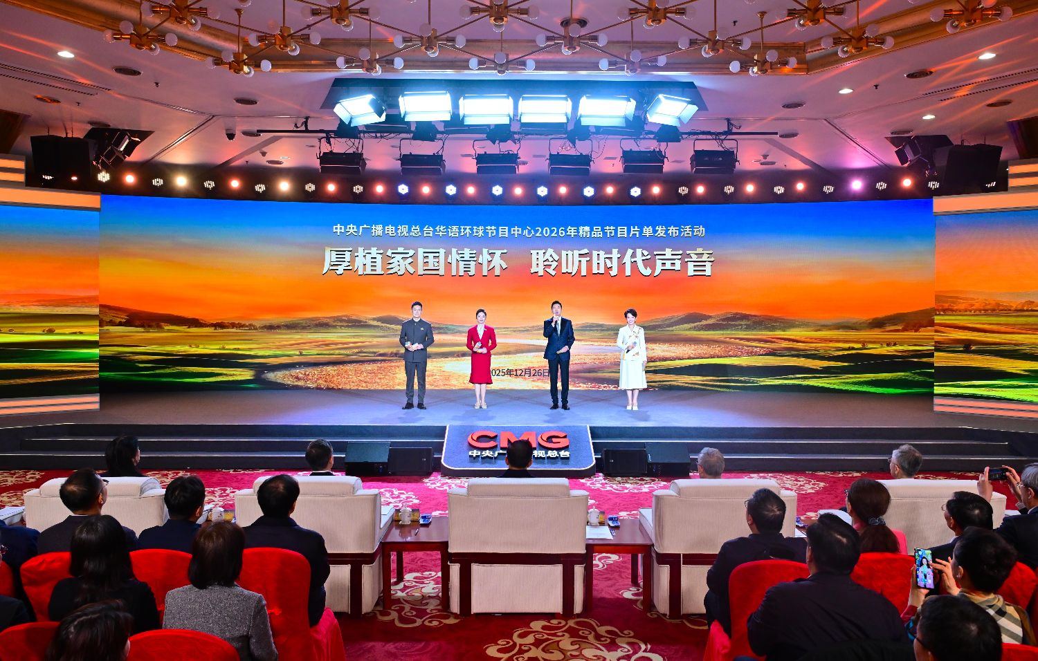12月26日,中央广播电视总台华语环球节目中心2026年精品节目片单发布活动在京举行。活动以“厚植家国情怀聆听时代声音”为主题,分五个篇章发布40余档精品节目,全景展示中国式现代化的壮美新篇、中华文明的隽永风采,以及高水平对外开放的共赢诗篇。中宣部副部长、中央广播电视总台台长慎海雄出席,并与中国国际贸易促进委员会会长任鸿斌,中央党史和文献研究院副院长孙东升,国务院发展研究中心副主任张琦,全国政协常委、中国作家协会副主席陈彦,宁夏回族自治区党委常委、宣传部部长冼国义等共同发布精品节目片单。