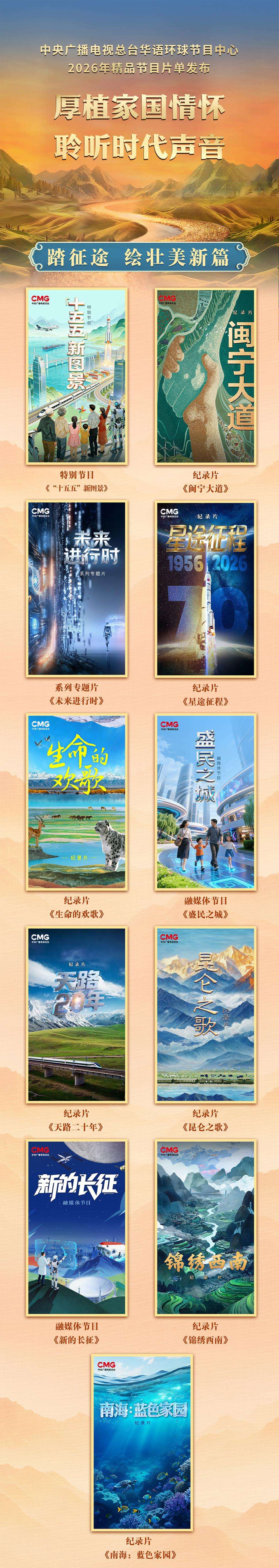“踏征途,绘壮美新篇”板块共发布11档节目,聚焦高质量发展的跬步千里,彰显中国人民砥砺奋斗的坚实步履。特别节目《“十五五”新图景》集中展示“十五五”开局之年中国乘势而上、接续推进中国式现代化建设的奋进姿态。纪录片《闽宁大道》全景呈现闽宁协作三十年从对口帮扶到高质量发展的共同富裕之路。系列专题片《未来进行时》对话科技创新领军人物和前沿创业者,解读新兴产业和未来产业的蓬勃发展。纪录片《星途征程》回顾中国航天70年从无到有再到强的辉煌历程。纪录片《生命的欢歌》聚焦国家公园候选区,以国际化表达展现中国生态文明建设成就。融媒体节目《盛民之城》展现城市更新、助力中国特色城市现代化的生动实践。纪录片《南海:蓝色家园》立体呈现南海生态系统的自然演变、珊瑚岛礁的民生变迁、“古今丝路纽带”的历史印记。纪录片《昆仑之歌》铺展昆仑地区生态共生、文化传承、民族交融、时代发展的真实图景。融媒体节目《新的长征》聚焦航空航天、量子科技、人工智能等领域青年奋斗者对长征精神的传承与实践。纪录片《锦绣西南》生动记录西南地区在脱贫攻坚、乡村振兴、交通基建等领域的发展成就。纪录片《天路二十年》以青藏铁路全线通车20周年为背景,集中展示青藏铁路促进民族团结与边疆巩固的作用。