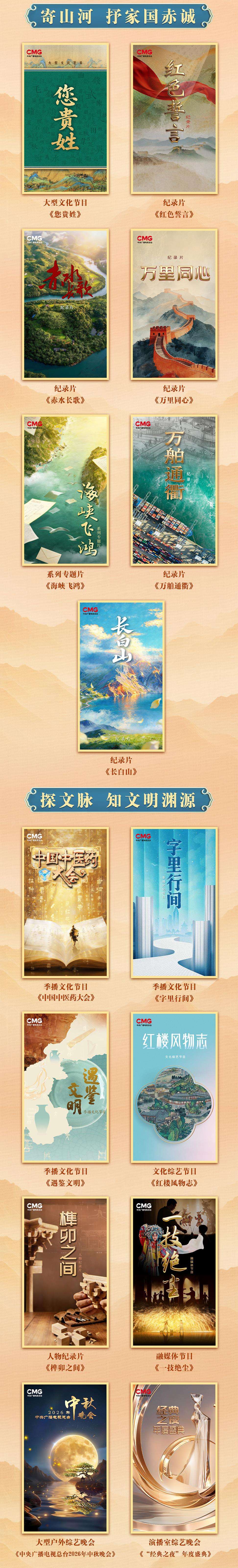 “探文脉,知文明渊源”板块发布8部文化类节目,以创新表达向世界展现中华文明的独特魅力和时代风采。季播文化节目《中国中医药大会》深入各地探寻中医药文化,诠释中医药在构建人类卫生健康共同体中的独特贡献。季播文化节目《字里行间》以文学为脉络、城市为舞台,讲述地域文化与文学创作之间深刻共鸣的动人故事。季播文化节目《遇鉴文明》邀请国际中国学权威专家,在交流互鉴中展现中华文明的兼收并蓄、历久弥新。文化综艺节目《红楼风物志》围绕《红楼梦》里的诗词、书画、美食等解读中国人的审美情趣、哲学思想和生活智慧。人物纪录片《榫卯之间》从古建传承人的故事中领略中华建筑之华章璀璨。融媒体节目《一技绝尘》聚焦中国传统戏曲与非遗“独门绝技”。《中央广播电视总台2026年中秋晚会》《“经典之夜”年度盛典》聚焦时代精品,致敬文艺经典。