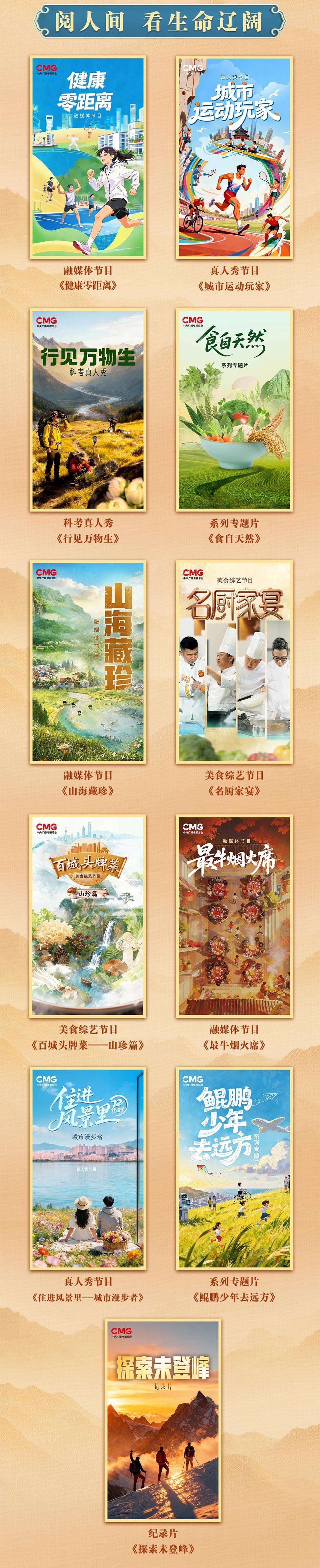 “阅人间,看生命辽阔”板块发布11部文化类节目,立足以人为本,聚焦民生需求与美好生活向往,生动展现“以人民为中心”的发展实践。融媒体节目《健康零距离》普及健康理念,提升全民健康素养。真人秀节目《城市运动玩家》通过“运动探城”的方式助力城市文旅品牌升级。科考真人秀《行见万物生》深入自然保护区核心区,探索鲜为人知的自然秘境。融媒体节目《山海藏珍》探访“国家地理标志产品”,展开文旅与区域产业相融合的发现之旅。美食综艺节目《名厨家宴》以国家名厨与不同地域菜系的碰撞,传递饮食文化中的人文温度。系列专题片《食自天然》全景展示中国绿色食品从田间到餐桌的全流程标准化建设。美食综艺节目《百城头牌菜——山珍篇》聚焦各地最具代表性和影响力的招牌美食,以一道菜“解码”一座城。融媒体节目《最牛烟火席》以年轻态的表达方式,探寻筵席文化背后的地域特色与人文精神。真人秀节目《住进风景里——城市漫步者》以特色酒店为载体,彰显东方生活美学。系列专题片《鲲鹏少年去远方》让广大青少年读万卷书、行万里路,体验中华历史文化,感悟新时代中国的蓬勃发展。纪录片《探索未登峰》纪实跟拍登山者共同挑战人类未曾踏足山巅的壮举。