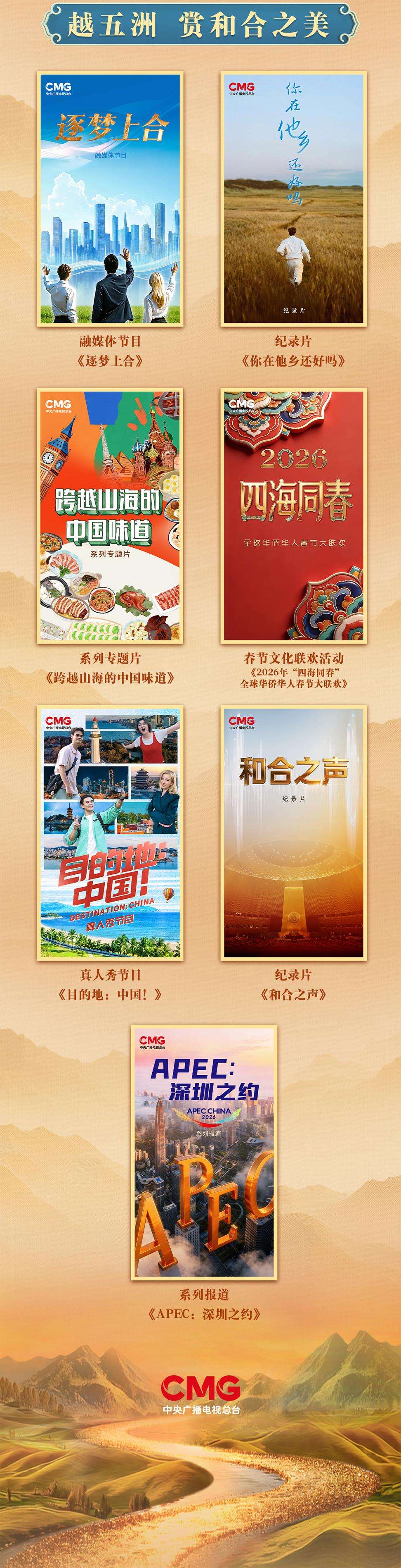 “越五洲,赏和合之美”板块发布7部精品佳作,以国际化视角阐释“四大全球倡议”和人类命运共同体理念。融媒体节目《逐梦上合》讲述上海合作组织成立25年来,共建“上合家园”的青年力量。纪录片《你在他乡还好吗》记录长期定居中国乡村的外籍人士“此心安处是吾乡”的异国生活。系列专题片《跨越山海的中国味道》展现中国饮食文化在海外的融合创新发展。《2026年“四海同春”全球华侨华人春节大联欢》增强海外华侨华人的文化认同感和归属感。真人秀节目《目的地:中国!》聚焦“外国人来华免签政策”,打造权威的“来华旅游指南”。纪录片《和合之声》以中国重返联合国55周年为背景,展现中国为完善多边机制贡献的智慧与方案。系列报道《APEC:深圳之约》以2026年在深圳举办的APEC第三十三次领导人非正式会议为契机,展现中国在数字经济、人工智能等领域的新成就。