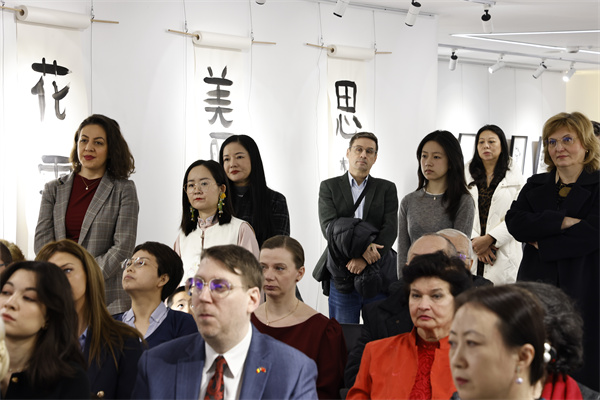 经典名著《喻世明言》第一卷《蒋兴哥重会珍珠衫》、90岁高龄的汉学家多罗班图所译《水浒传》节选罗语版在罗首次发布,吸引众多中国古典文学爱好者交流讨论。出版社展位前读者络绎不绝,展出图书品类丰富,既有《习近平谈治国理政》《庄子》《三体》等作品的罗马尼亚语译本,也有一系列由当地学者撰写的涵盖当代中国政治、经济发展、传统文化与社会变迁的原创著作,满足不同年龄段读者的阅读需求。活动现场精心布置的小型书法展同步向观众开放,展区以素雅宣纸与毛笔书法作品为主体,呈现了七岁的罗马尼亚汉字书法爱好者西蒙•亚博勒的创作,将汉字的线条之美与哲学意蕴融入空间之中。
