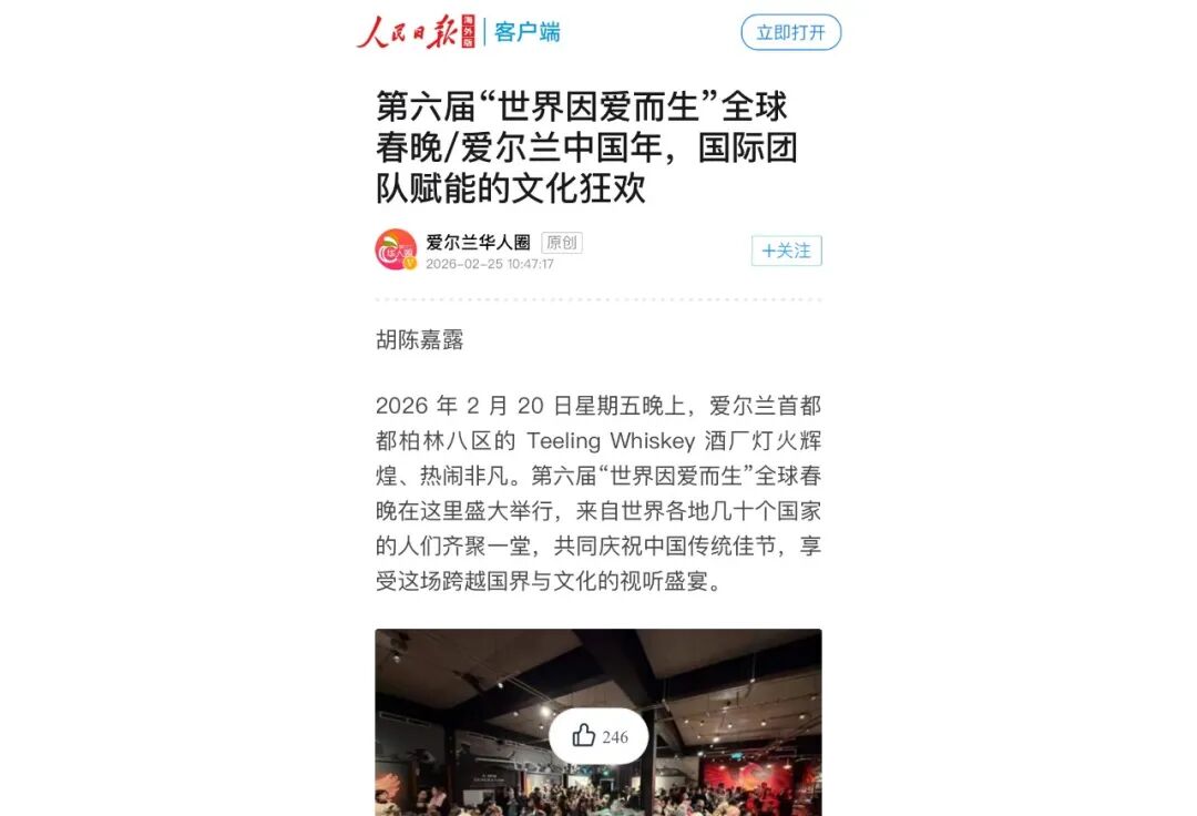 不仅如此,他更凭借其在主流媒体平台的传播号召力,成功将本届春晚的盛况发布在《人民日报海外版》,让爱尔兰侨界的“爱之声”跨越重洋,在最具权威的海外华文传播平台上得以发声。他用精准的数字化触达与主流平台的共振,为“种族融合”与文化传播提供了坚实的技术保障和流量支撑。