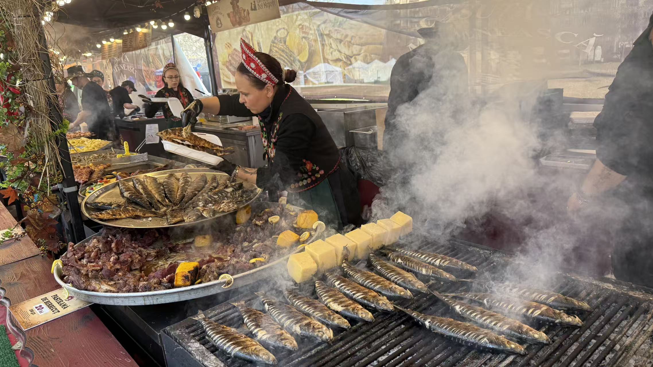 本届渔业美食节汇集了来自多瑙河流域及黑海沿岸的多种新鲜鱼类,包括鲤鱼、鲫鱼、鲈鱼以及传统烟熏鱼等,摊位林立,香气四溢。现场厨师采用煎、炸、烤等多种烹饪方式,将罗马尼亚传统风味与现代餐饮理念相结合,吸引了众多食客驻足品尝。