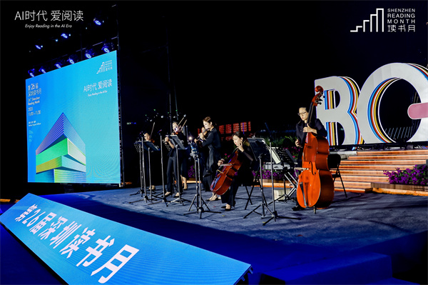 活動在一場別開生面的詩意演奏中開啟。星空下,深圳交響樂團八位藝術家登場,小提琴的靈動、長笛的清越與電鋼琴的現代感交織,巴赫《勃蘭登堡第五協奏曲》為全場觀眾帶來了沉浸式文化體驗。隨後,與會觀眾共同觀看了第二十六屆深圳讀書月主題宣傳片《AI時代 愛閱讀》,片中回顧了過往讀書月的精彩瞬間,展望了未來閱讀的更多亮點與期待。