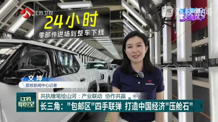 荔枝新聞中心記者文坤說:「這輛新能源汽車從零部件進場到整車下線,僅用了24小時:昨天上午,上海研發中心的工程師敲定了自動駕駛系統參數;中午,江蘇常州的動力電池、蘇州的車載顯示屏就運到廠區;下午,浙江寧波的電機、安徽合肥的底盤部件陸續進場;今天一早,所有零部件在無錫的總裝線匯合,現在它已經可以駛下生產線,準備交付客戶了。這樣的效率,不是偶然。長三角早已形成『研發 + 製造 + 配套』的全鏈條汽車產業生態,可以說在半徑四小時車程的『包郵區』內,從硬件到軟件,從設計到製造,新能源汽車所需的零部件全部都能配齊。」