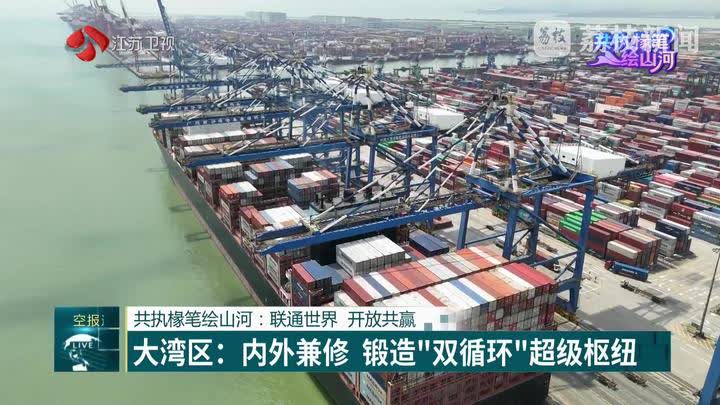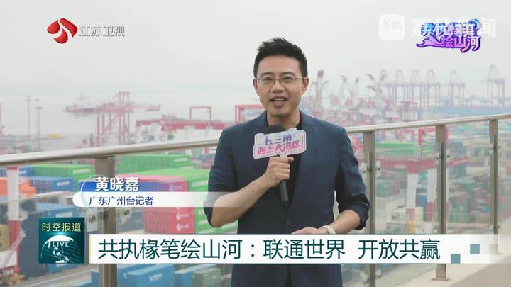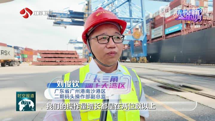 廣東廣州台記者黃曉嘉說:「我們將聯動深圳、珠海兩地媒體同行一起帶大家感受大灣區的開放活力。此刻,我正站在粵港澳大灣區的地理幾何中心——廣州港南沙港區的碼頭。外貿箱量16年來首次反超內貿箱量,是今年這座大港的一件里程碑事件。『經略腹地』與『面向海洋』協同發力,真是妥妥的『雙循環』高手、大灣區超級接口,這身『內外兼修』的功夫到底是如何練就的呢?」