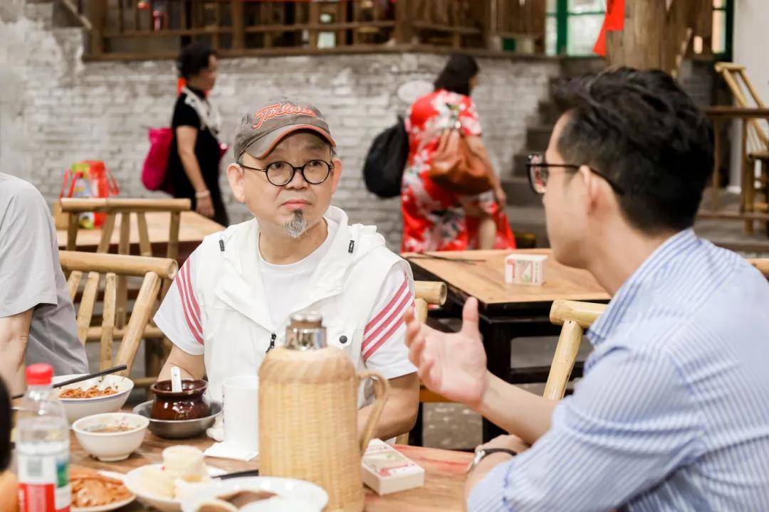 作家龙一(左)在民德路茶馆体验南昌特色美食