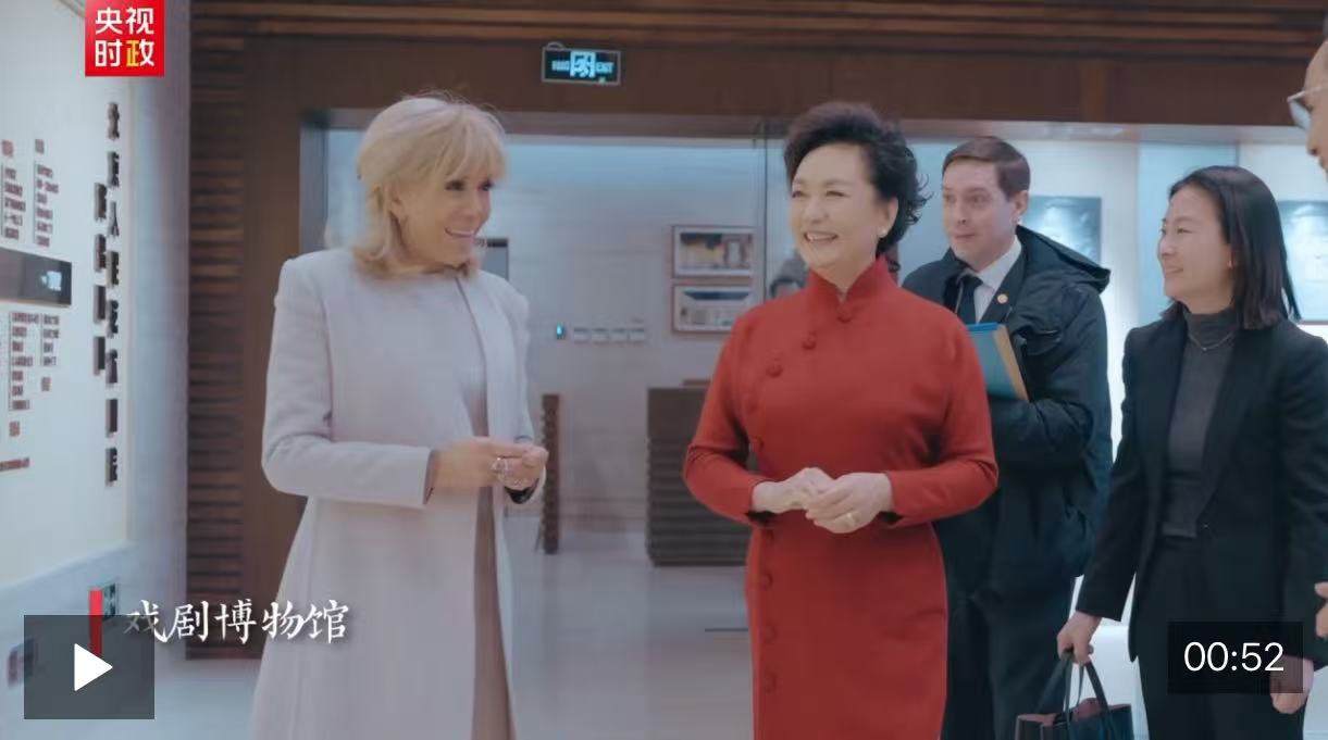 彭丽媛和布丽吉特一同前往戏剧博物馆,详细了解北京人艺发展历程及同法国戏剧界交往情况。两国元首夫人在剧场饶有兴致地观看经典话剧《茶馆》舞台布景。在戏剧中心,彭丽媛邀请布丽吉特共同欣赏话剧片段,并同演员亲切交流。