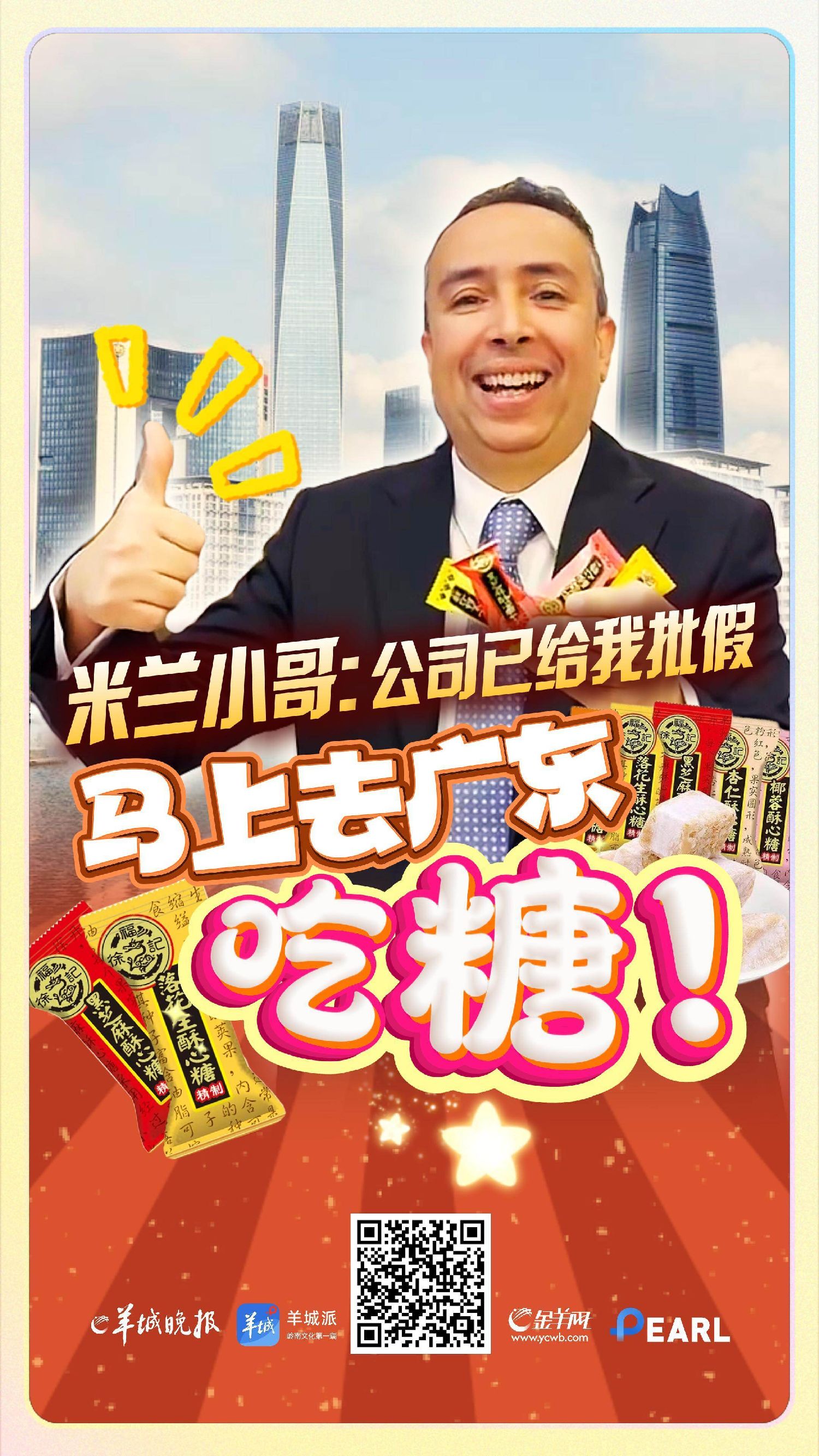 让米兰小哥Karem更惊喜的是,这场源自民间的接力,很快得到官方的加持。糖果生产厂家徐福记得知该热点事件后,不仅在官方社交平台向米兰小哥Karem发出邀约,邀请小哥到东莞工厂参观,见证这颗糖的生产全流程,更派出专人直达意大利米兰,将邀请函和糖果送到米兰小哥Karem手上。同时送达的,还有一众“东莞优品”好物,包括荔枝干、荔枝酥、麦芽糖柚皮、东莞潮玩等。