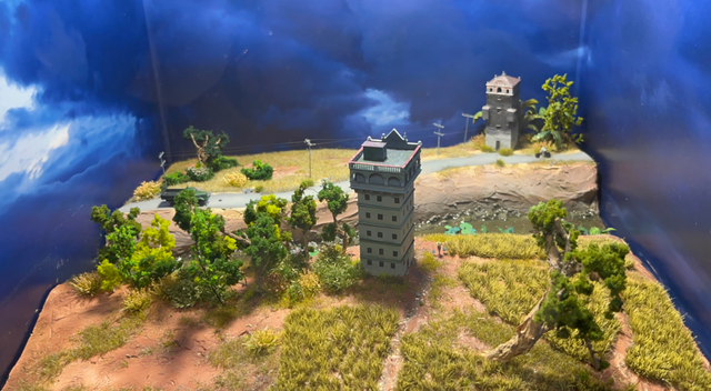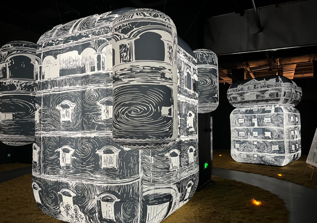 尤其是展览第五部分创新尝试无实物展品表达,设置四座体量巨大的气模碉楼,以印象派版画的斑驳质感矗立在氤氲水雾的稻田之中,朦胧光影交织出如梦似幻的意境。印象派风格的版画图案铺垫出细腻的视觉基底,巨形碉楼装置带来强烈的感官冲击,水雾机制造的轻纱般氛围,进一步强化了“梦境”与“诗意”的质感。观众可穿行于稻田与碉楼之间,仿佛踏入了华侨先辈魂牵梦萦的故乡幻境,在全方位的感官冲击中,触摸侨胞心底最柔软的乡愁。