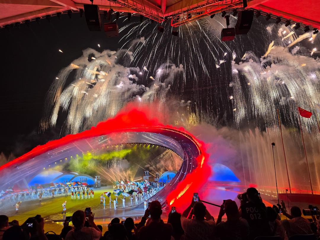 在传统的剧场或体育馆里,观众席上方和四周往往密密麻麻挂满了各种灯具。它们不只是为了把舞台照亮——正面光让观众看清演员的脸,侧面光和背面光勾勒出人物的轮廓和立体感,不同颜色的灯光还能烘托情绪。但海边没有这些条件。亚沙会开幕式场地正对大海,舞台背后是海天交界线。