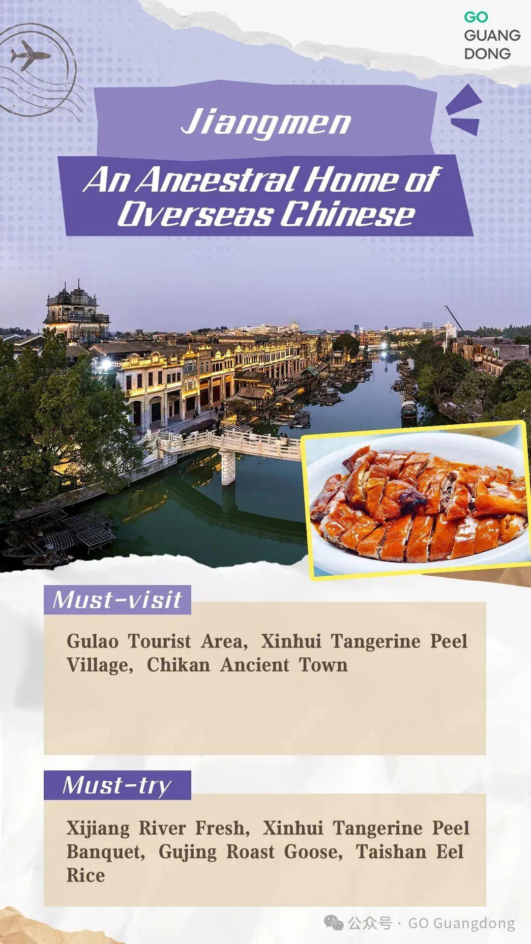 Jiangmen, China's foremost hometown of overseas Chinese, preserves its rich history as well as the traditional delicacies. Visitors can experience the rich traditions of overseas Chinese communities in Gulao Tourist Area and Chikan Ancient Town, and taste ancient culinary delights such as eel rice, Gujing Roast Goose, river fresh and tangerine peel banquet.