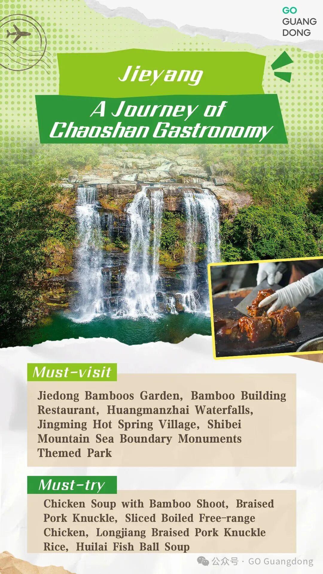 The journey takes you from the lush bamboo groves of Jiedong Bamboos Garden, where you can taste chicken soup with bamboo shoot, to the splendid Huangmanzhai Waterfalls. Enjoy braised pork knuckle and sliced boiled free-range chicken, take a break at Jingming Hot Spring Village, then cross off Longjiang braised pork knuckle rice in the town, and savor a bowl of Huilai fish ball soup alongside the beautiful sea.