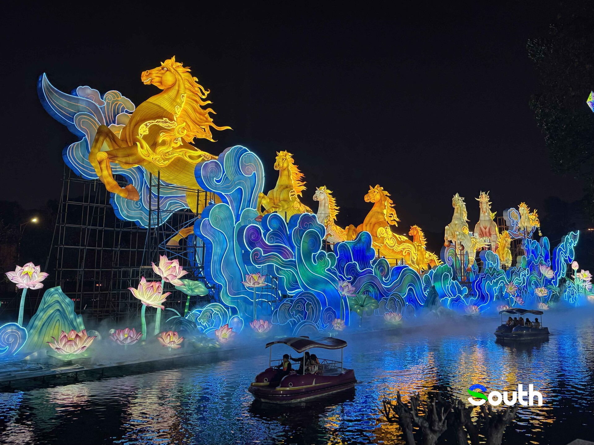 One of the largest installations features a group of luminous running horses, frozen mid-gallop. In Chinese culture, the horse symbolizes energy, perseverance, and moving forward without fear. It is closely linked to the Chinese zodiac system, where each year corresponds to an animal carrying symbolic meaning. The dynamic motion of the horses feels powerful—almost cinematic. Under the lights, they seem to be charging into the new year, carrying hope and ambition with them.