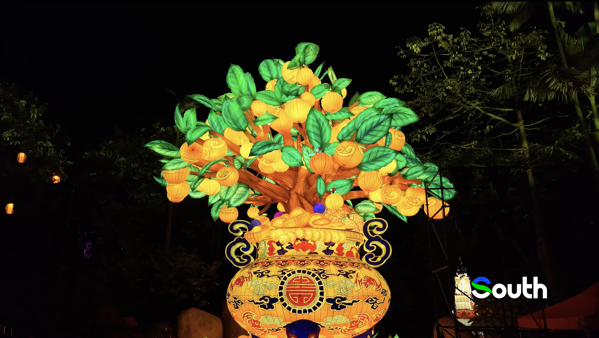 In Guangzhou, buying flowers before New Year is not optional—it's ritual. Locals call it "walking the flower street" (行花街). One lantern installation titled "Good Luck & Prosperity" draws inspiration from this tradition. At its center are kumquat trees—small orange fruits whose name in Cantonese sounds like "good fortune." Kumquats symbolize wealth and blessings, and almost every local household places one at home during the New Year.