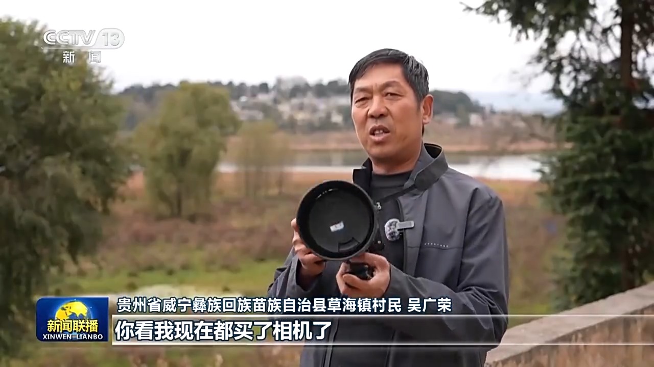 贵州省威宁彝族回族苗族自治县草海镇村民 吴广荣:房前屋后的卫生是越来越干净的,在我们草海有十来万只鸟来越冬,你看我现在都买了相机了,随时可以拍鸟,生活水平是越来越高了。