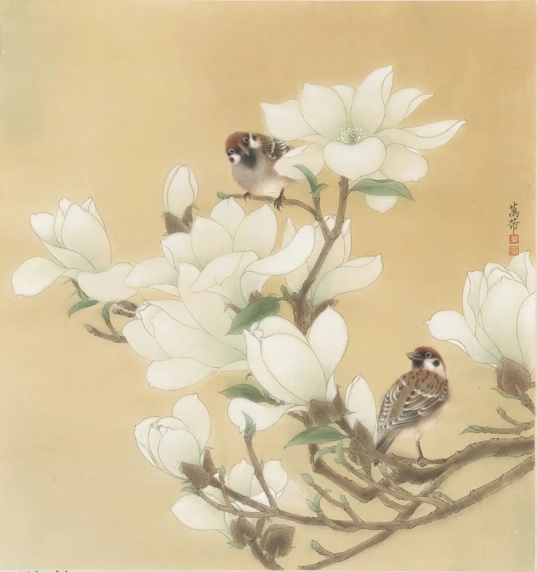 万芾是上海实力派花鸟画家,她笔下“花鸟世界”中的二十四节气,作品色彩丰富,构图现代而不失传统韵味。